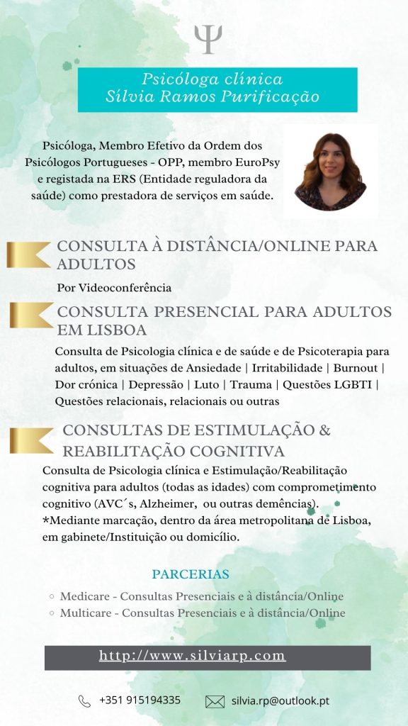 Áreas de intervenção: Situações de Ansiedade | Irritabilidade | Burnout | Dor crónica | Depressão | Luto | Questões LGBTI | Desenvolvimento pessoal | Questões relacionais e/ou emocionais
